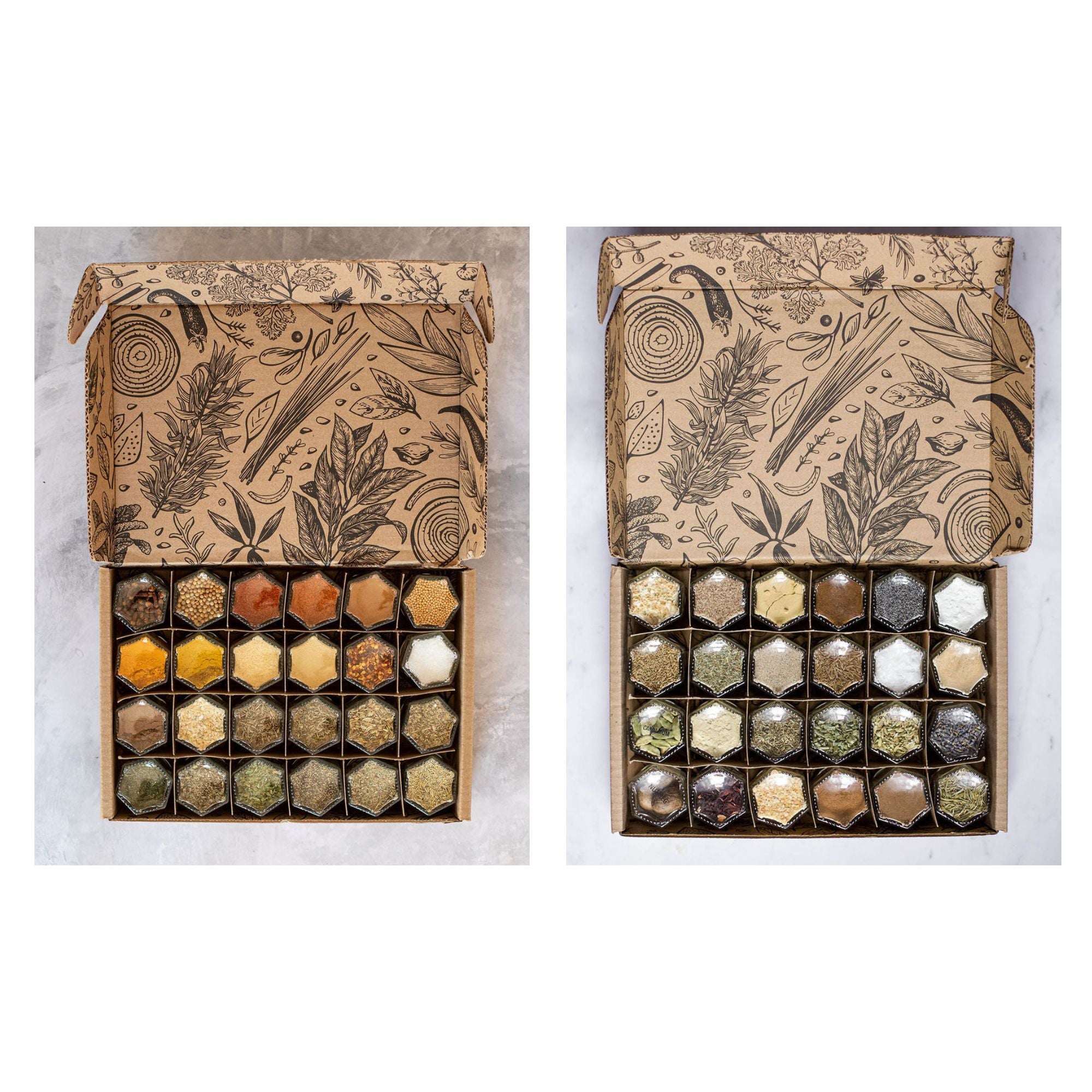Allspice (ground), anise seed, arrowroot powder, basil, caraway seed, cardamom (ground), cayenne, chai masala, chili flakes, cinnamon (cassia, ground), clove (ground), cloves (whole), coriander (whole), cream of tartar, crystallized ginger, cumin (whole), curry powder, Cyprus salt, dill (weed), fennel seed, garlic granules, ginger (ground), hibiscus petals, lavender, lemon peel powder, mace (powder), mustard seed, nutmeg (whole), onion flakes, oregano, paprika (Spanish), parsley, pepper, poppy seed, pumpkin pie spice, rose petals, rosemary (leaf), sage, sesame seeds (tan), sprinkles (chocolate), sprinkles (rainbow crunchies), star anise (whole), turmeric (ground), thyme, vanilla sugar, and white pepper (ground).