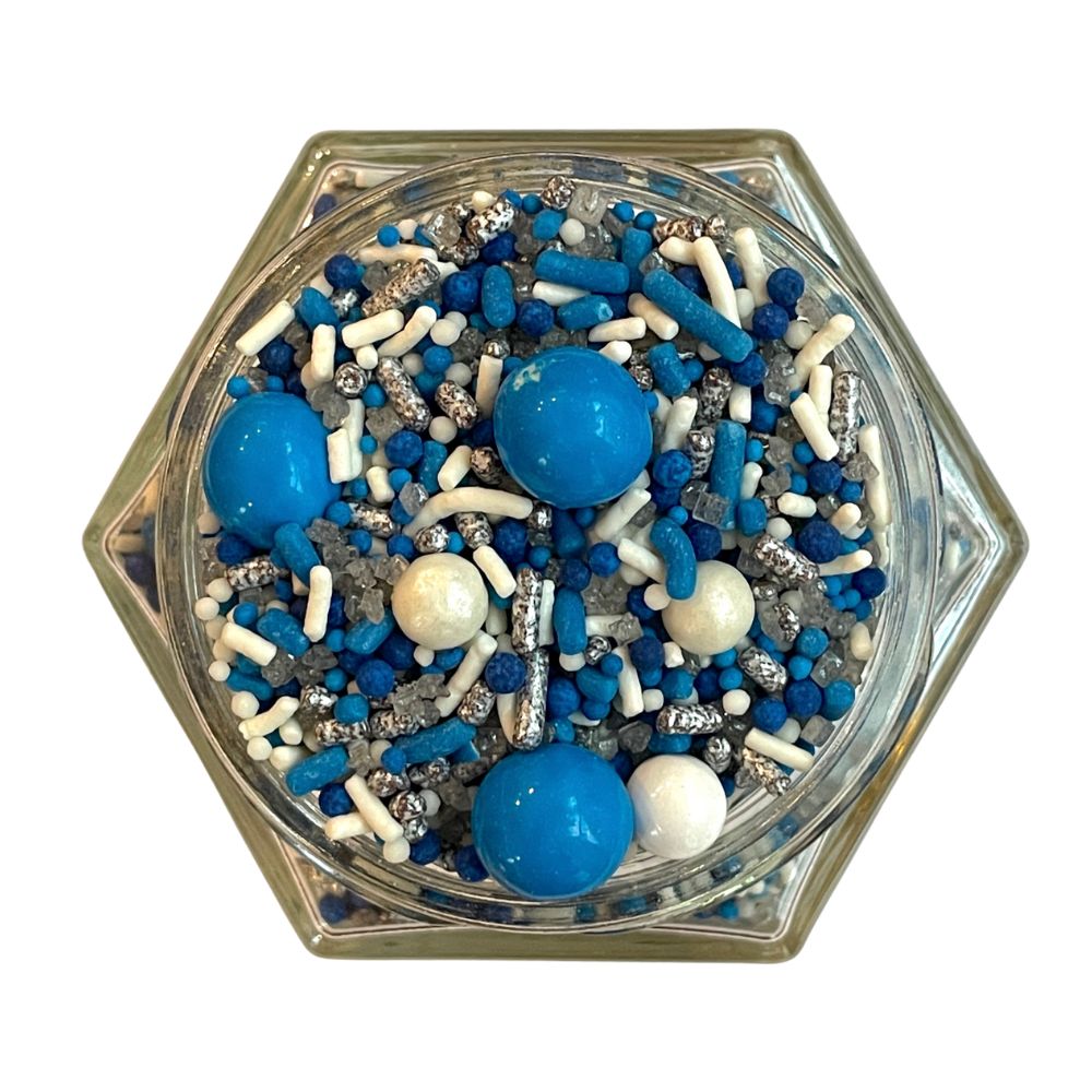 Gneiss Spice Sprinkles — All-Natural Holiday "Snow Fall" Hannukah: a hexagonal glass jar with blue and white rods, round balls, and snowflake shapes, seen from above on a white background.
