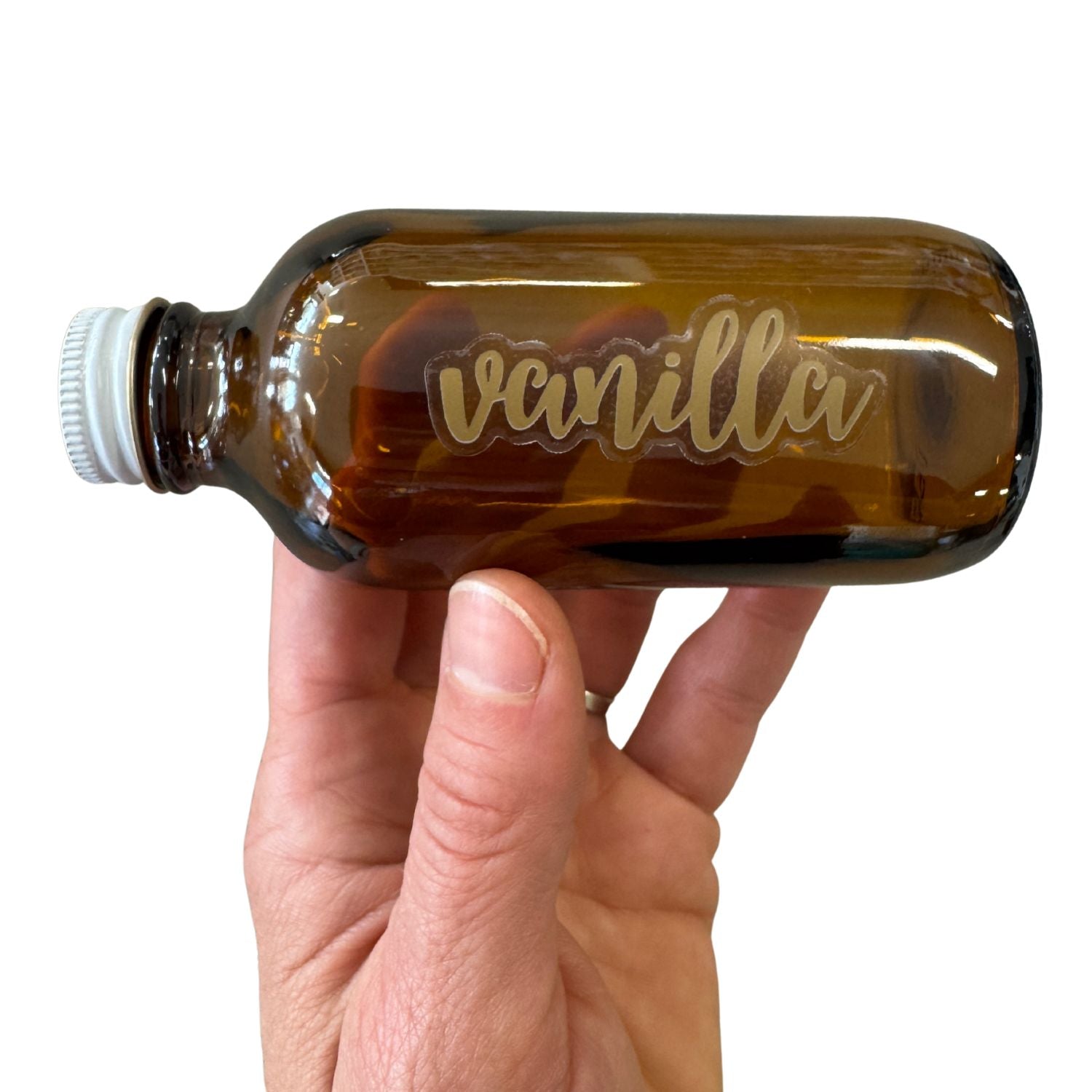 An affordable label option for your homemade vanilla gifts. Clear stickers printed in gold or white font. They’re specifically designed to fit extract Blake or Boston bottles or wide-mouth paste jars, but they can also be easily applied to any glass bottle you have at home.